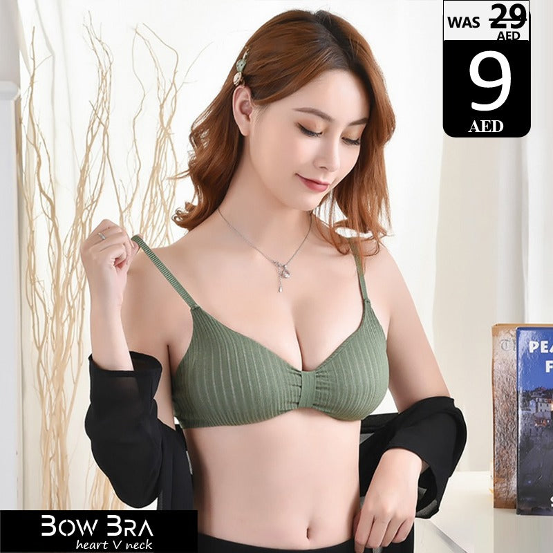 Comfort meets style with this Bow Bra featuring a heart-shaped V-neck design. Made from soft, ribbed fabric, it offers light support and a flattering fit. Available in multiple trendy colors, perfect for everyday wear. Now only 9 AED (was 29 AED)!