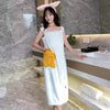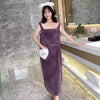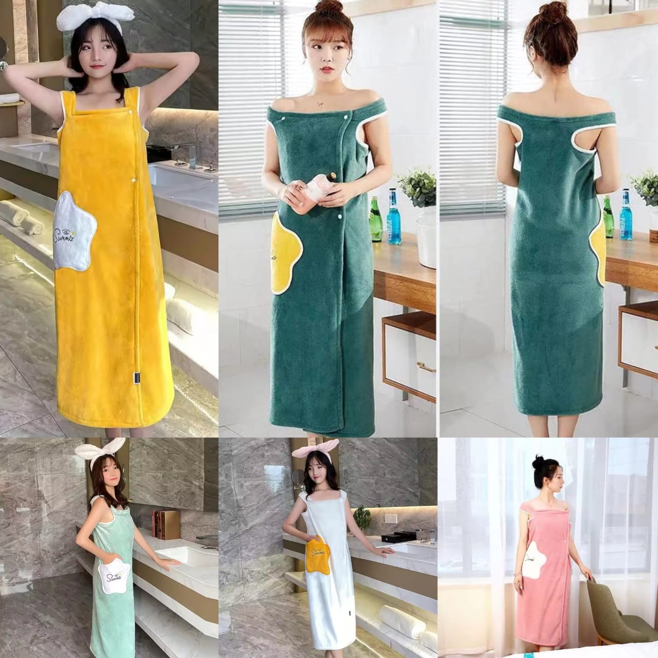 Wearable Towel Bath Dress This adorable wearable towel dress is the ultimate post-shower essential! Crafted from soft, ultra-absorbent microfiber fabric, it wraps you in cozy comfort like a towel but wears like a stylish off-shoulder maxi dress. Features a convenient front zipper, cute embroidered patches (e.g., stars or clouds), and a long, flowing fit for full coverage. Available in vibrant colors like yellow, green, pink, and blue—perfect for lounging at home, spa days, or quick drying. One size fits most; machine washable for easy care. Stay cute and dry!