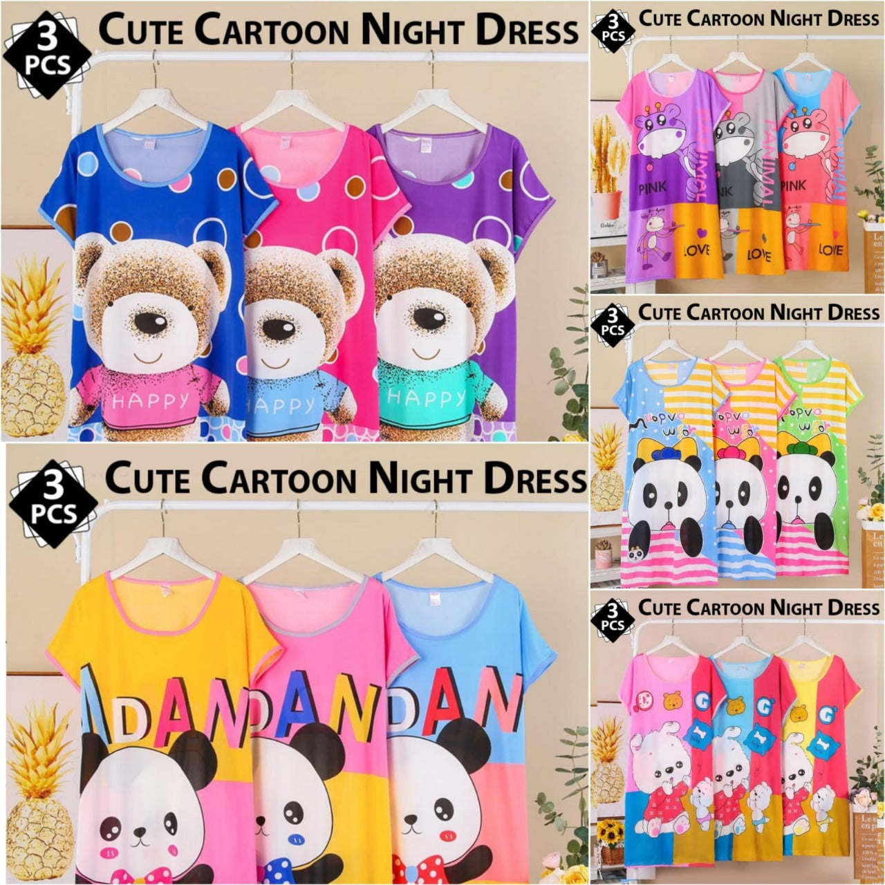 This product is a collection of cute cartoon nightdresses, perfect for comfortable lounging and sleep. They are sold in assorted sets of three and feature: